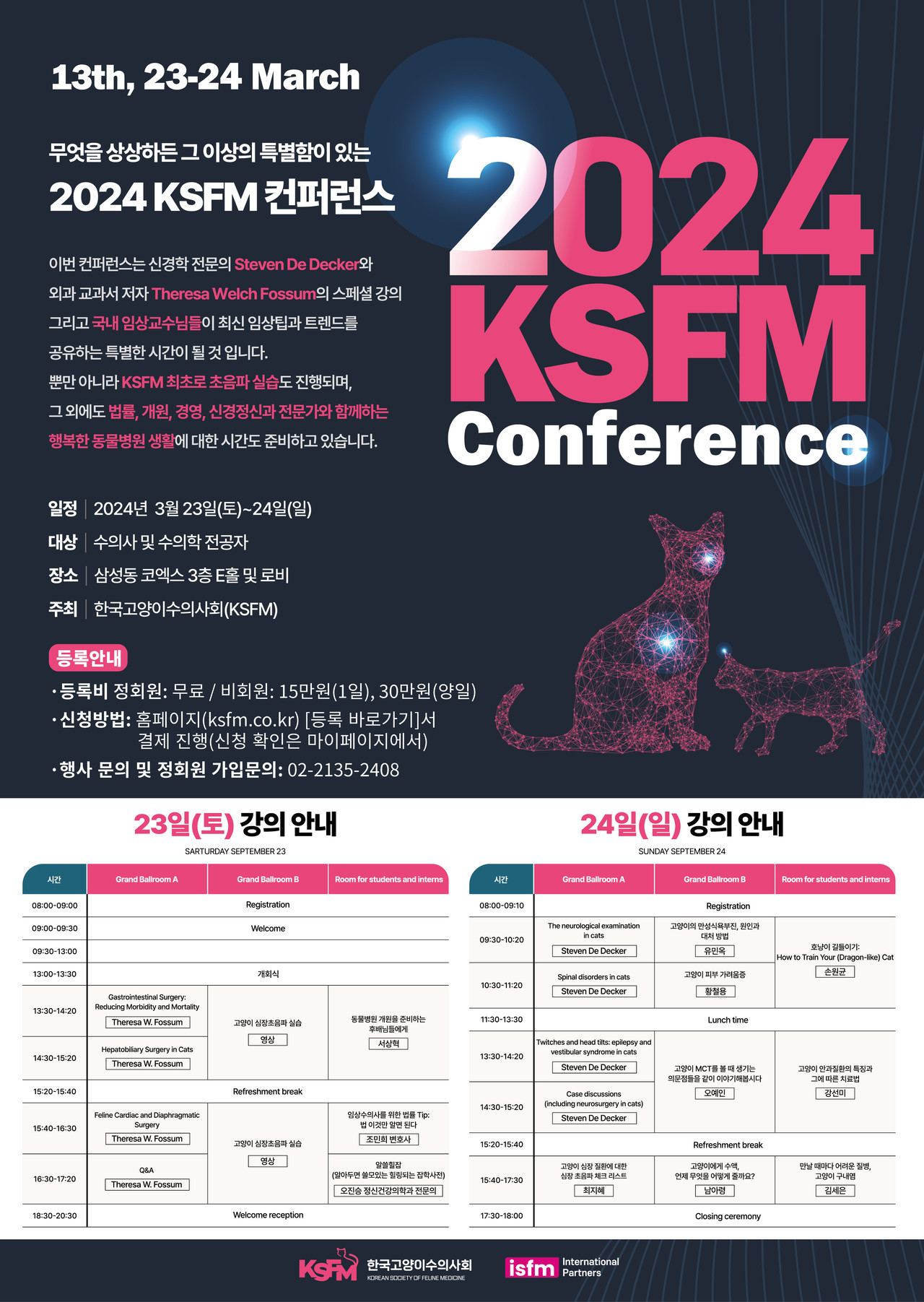 한국고양이수의사회(회장 김지헌, 이하 KSFM)가 13번째 ‘2024 KSFM Conference’를 오는 3월 23일(토)~24일(일) 삼성동 코엑스 3층 E홀에서 막을 올린다.