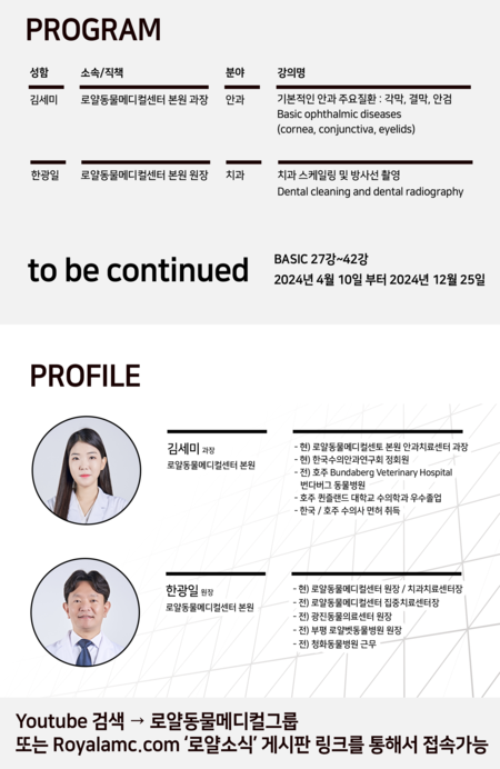 이번 강의는 안과와 치과 테마 각각 1강씩 총 2강으로 구성, 김세미(로얄동물메디컬센터 본원) 안과과장이 ‘기본적인 안과 주요질환: 각막, 결막, 안검’을, 한광일(로얄동물메디컬센터 본원) 원장 ‘치과 스케일링 및 방사선 촬영’에 대해 강의한다.