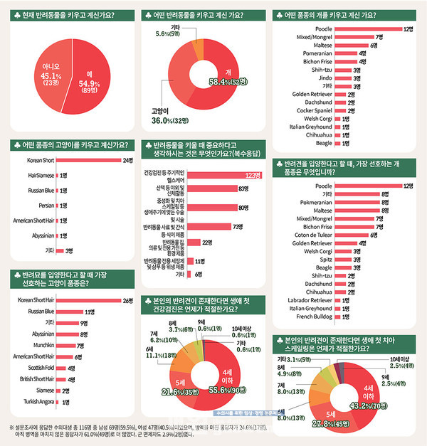 동물의료를 위한 커뮤니케이션 플랫폼 ‘베트윈(VETWEEN)’이 지난해 11월 1일부터 12월 31일까지 수의사 총 162명을 대상으로 조사한 ‘수의사의 반려동물은?’ 설문조사에서 현재 반려동물 키우고 있는 수의사는 54.9%(89명)로 키우지 않는 수의사 45.1%(73명) 보다 10% 정도 많은 것으로 나타났다. 키우는 반려동물로는 개가 58.4%(52명)로 고양이 36.0%(32명)보다 20% 이상 더 많이 키우고 있었으며, 키우는 개 품종으로는 ‘푸들’이, 고양이 품종은 ‘코리안 숏 헤어’가 가장 많았다. 입양 시 선호하는 반려견 품종 역시 현재 가장 많이 키우고 있는 품종과 일치했다. 반려동물을 키울 때 중요하다고 생각하는 것으로 ‘건강검진 등 주기적인 헬스케어’를 1위로 꼽았으며, 이어 ‘산책 등 야외 및 신체활동’, ‘중성화 및 치아스케일링 등 생애주기에 맞는 수술 및 시술’, ‘반려동물 사료 및 간식 등 식이 제품’ 순으로 조사됐다. 반려견과 반려묘 모두 생애 첫 건강검진과 첫 치아 스케일링 시기로 ‘4세 이하’가 가장 많았다. 영양제는 ‘비정기적으로 영양제를 급여하는 경우’가 40.7%(66명)로 가장 많았으며, ‘정기적으로 급여하는 경우’가 24.7%(40명)인 반면 ‘급여하지 않는 경우’는 31.5%(51명)로 더 많았다. 아픈 반려동물에게 치료 및 증상 완화 목적으로 영양제를 주는 것에 대해서 절반 이상인 56.8%(92명)가 ‘긍정적이다’라고 답했으며, ‘상관없다’고 답한 경우도 32.7%(53명)였다. ‘부정적이다’는 견해도 10.5%(17명)로 나타났다. <편집자주>