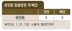 행정안전부 최신 데이터에 따르면, 광진구 광장동은 1999년부터 동물병원이 개원하기 시작해 2024년 1월 31일 기준 총 6개소가 개원, 이 중 3개소(50%)가 문을 닫고, 현재 3개소(50%)가 개원을 유지하고 있다.