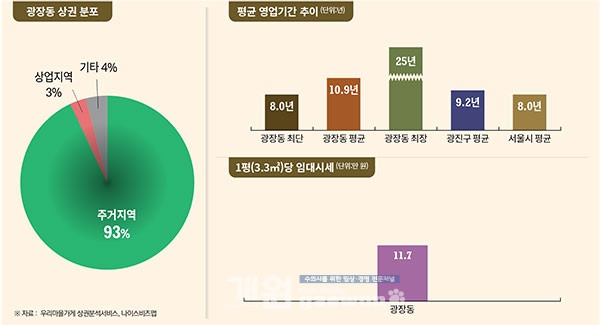 광진구 광장동은 주거지역 93%, 기타지역 4%, 직장오피스가 3%로 구성된 주거지역 93% 위주의 상권이다.