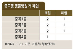 행정안전부 최신 데이터에 따르면, 광진구 중곡동은 1996년부터 동물병원이 개원하기 시작해 2024년 1월 31일 기준 총 10개소가 개원, 이 중 3개소(30%)가 문을 닫고, 현재 7개소(70%)가 개원을 유지하고 있다.