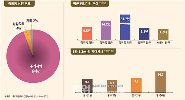 광진구 중곡동은 주거지역 94%, 주거상업 4%, 기타지역 2%로 구성된 주거지역 위주의 상권이다. 특히 중곡3동은 주거지역 100%로 구성되어 있을 정도로 주거지역의 비중이 높다.