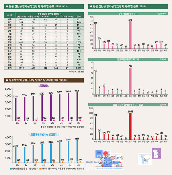 농림축산검역본부 동물약품관리과에서 발표한 2023년 12월 기준 ‘동물병원 방사선 발생장치 관리현황 및 방사선 관계종사자의 개인피폭선량 연보’에 따르면, 국내 동물병원에 설치된 동물 진단용 방사선 발생장치는 총 3,689대로 2016년 2,632대에서 7년만에 1,057대가 늘어 연평균 150대씩 증가한 것으로 나타났다.