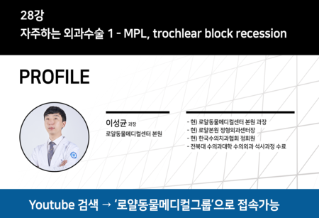 이번 강의는 28강으로 이성균(로얄동물메디컬센터 본원) 과장이 ‘자주하는 외과수술1-MPL, trochlear block recession’에 대해 강의할 예정이다.