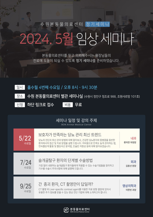 한편 본동물의료센터는 홀수 월 넷째 주 수요일마다 정기 세미나를 진행하고 있다. 다음 강의는 7월 24일(수) 김용선(외과) 원장이 ‘슬개골탈구 환자의 단계별 수술방법’을, 9월 25일(수) 이한빈(영상의학과) 과장이 ‘간 종괴 환자, CT 촬영만이 답일까?’를 주제로 강의할 예정이다.