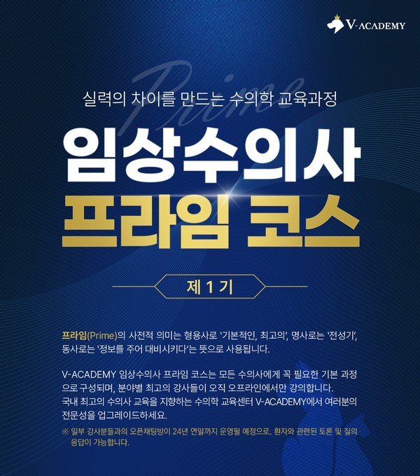VIP동물의료센터가 설립한 글로벌 수의학 교육기관 ‘V-ACADEMY(브이 아카데미)’가 임상의들을 위한 기본 교육과정 ‘제1기 임상수의사 프라임 코스’를 처음으로 실시한다. 수강생은 5월 7일(화) 오후 2시부터 선착순 50명 모집한다.