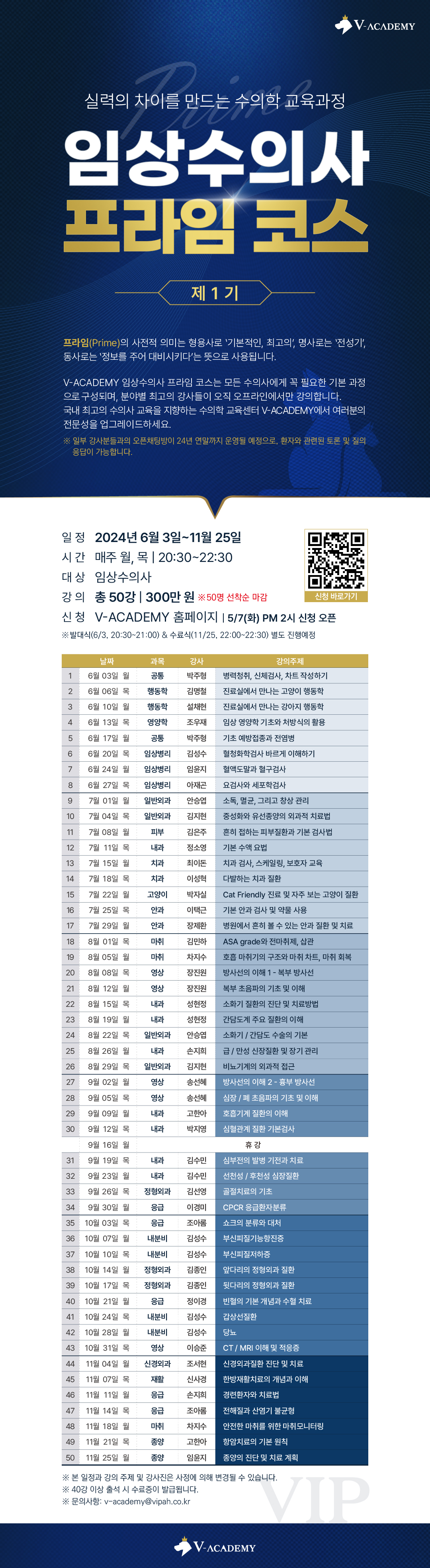 ‘임상수의사 프라임 코스’는 역량을 강화하고 싶은 수의사라면 누구나 신청 가능하고, 40강 이상 출석 시 수료증이 발급된다. 자세한 사항 확인 및 수강 신청은 V-ACADEMY 홈페이지(www.v-academy.co.kr)에서 가능하다.