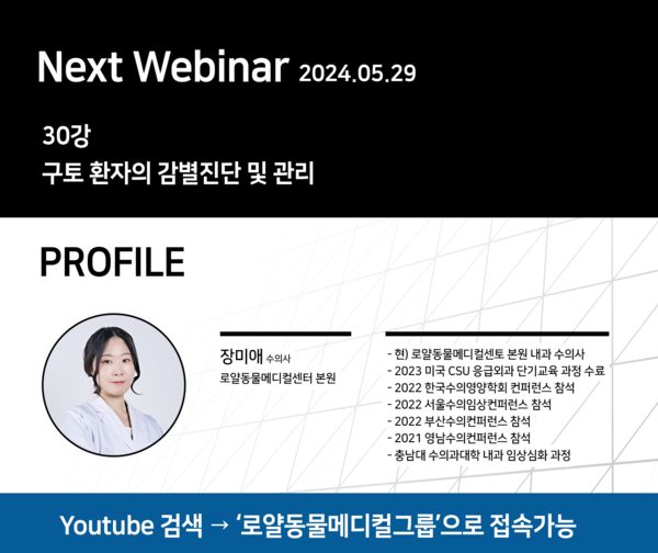 강의는 ‘로얄동물메디컬센터’를 유튜브에 검색한 후 접속하면 되고, 강의 관련 문의는 전화(010-3210-5728) 또는 메일(ataplan@naver.com)로 하면 된다.
