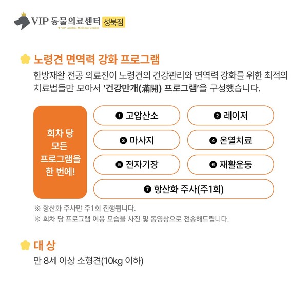 이번 프로그램은 VIP동물의료센터 성북점 한방재활 전공자인 이병희, 임수정 과장이 노령견의 건강 관리와 면역력을 위한 최적의 치료법을 모아 국내 최초로 구성한 노령견 면역력 강화 헬스케어 프로그램으로 8세 이상, 10kg 이하의 소형견들에게 적용 가능하다.