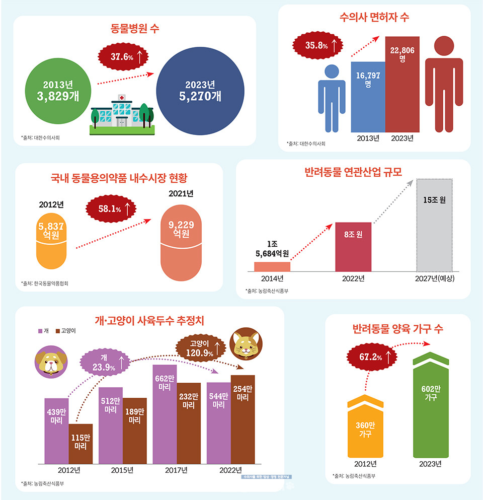 최근 10년간 수의계는 많은 변화와 함께 눈에 띄는 발전이 있었다. 전국 동물병원 수는 지난해 기준 5,000개를 돌파했으며, 수의사 면허자 수는 이미 2만 명을 돌파하며 수의사의 사회적 지위 또한 크게 성장했다. 반려동물 양육 가구 수는 10년 사이 2배 가까이 증가했으며, 반려동물 연관산업은 2014년 1조 5,684억 원에서 2022년 8조 원으로 가파른 성장세를 보였다. 정부는 오는 2027년까지 15조 원을 달성하겠다는 목표를 발표하기도 했다. 본지는 창간 10주년을 맞아 본지가 그동안 함께 걸어온 국내 수의계의 10년 발전도를 조명해봤다. <편집자주>