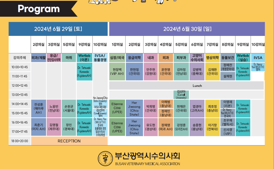 특히 해외 유명 연자들의 초청 강연이 주목을 끈다. ‘수의내과학’의 에팅거와 공저자인 Cote(코넬대) 교수를 비롯해, 김선아(코넬대 동물행동의학) 교수, 허지웅(오하이오대학 응급수의학) 교수의 강연이 준비돼 있으며, Dr. Tetsuaki Koreeda(Fujidera Animal Hospital) 원장이 TPLO 실습등 세계적인 연자들이 내한해 임상에 유용한 양질의 강의와 웹랩 실습 등 벌써부터 큰 관심을 모으고 있다.
