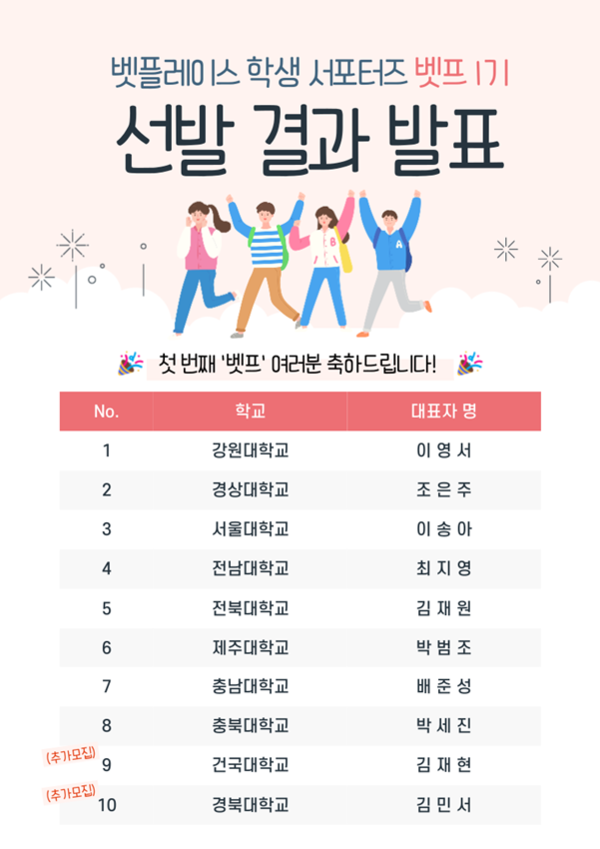 벳프 1기로 최종 선발된 인원은 10개 수의대별 1팀씩 23명, 총 10개 팀으로 선발된 학생에게는 소정의 활동비와 서포터즈 수료증이 지급되며, 수의컨퍼런스 참가 지원 혜택도 제공된다.