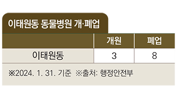 이태원동은 2013년 이후 약 11년 이상 신규 동물병원 개원이 없을 만큼 정체된 분위기가 유지되고 있다.
