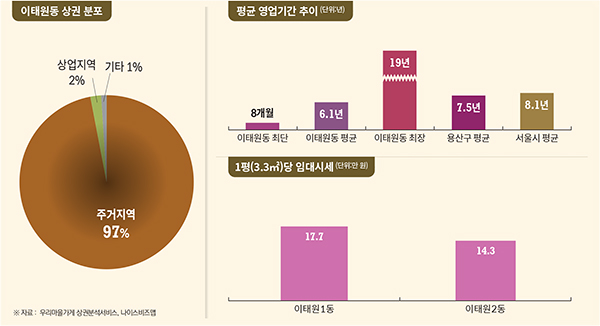 이태원1동의 1평(3.3㎡)당 건물 평균 임대료는 17만 7천원, 이태원2동은 14만 3천원으로 이태원1동은 용산구 내에서 두번째로 높은 가격이다.