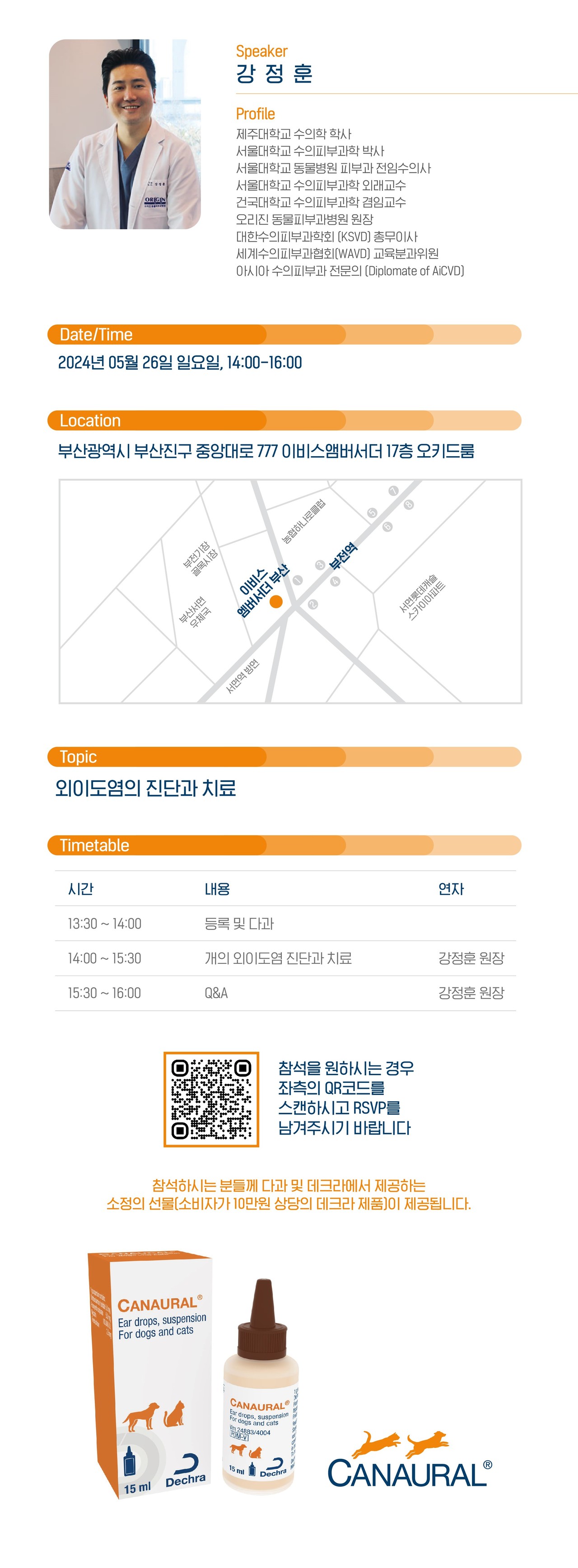 데크라베테리너리프로덕츠코리아(유)가 피부 치료 제품 론칭을 마치고, 5월 26일(일) 오후 2시 부산 이비스엠버서더에서 ‘개의 외이도염’ 세미나를 개최한다.