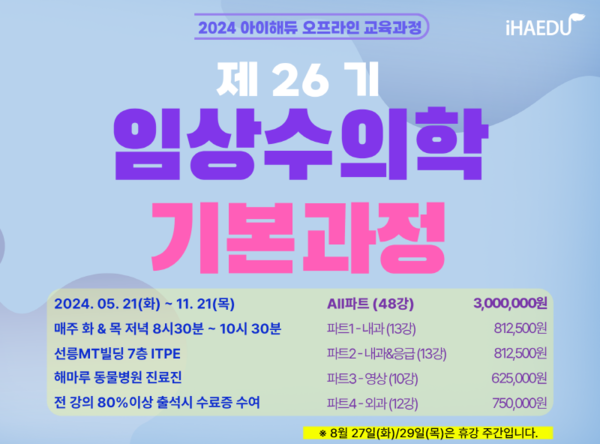 아이해듀가 ‘제26기 임상수의학 기본과정’을 오는 5월 21(화)부터 11월 21(목)까지 매주 화, 목요일 오후 8시 30분부터 10시 30분까지 선릉 ITPE에서 진행한다.