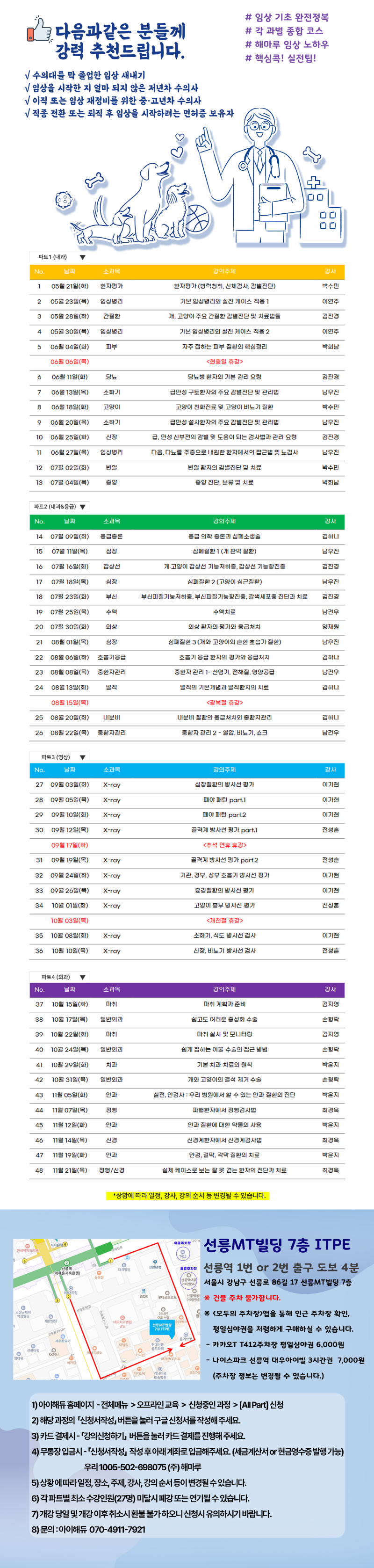 이번 기본과정은 해마루동물병원 김진경 원장을 비롯한 14명의 의료진이 연자로 나서 내과, 응급의학과, 영상의학과, 외과 파트로 총 48개의 강좌를 진행할 예정이다.