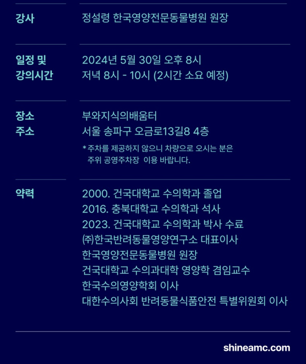 샤인동물메디컬센터가 5월 ‘월간 세미나’를 5월 30일(목) 오후 8시부터 10시까지 송파구에 위치한 부와지식의배움터에서 개최한다.
