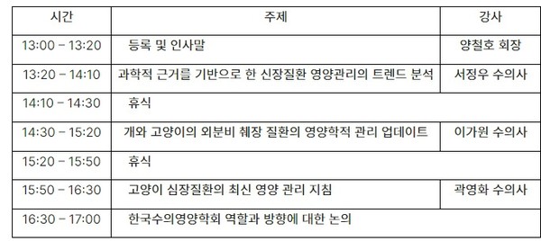 수의영양학회 정회원을 대상으로 진행되는 이번 세미나는 총 3개의 강의로 구성, 서정우 수의사의 ‘과학적 근거를 기반으로 한 신장질환 영양관리의 트렌드 분석’을 시작으로 이가원 수의사가 ‘개와 고양이의 외분비 췌장 질환의 영양학적 관리 업데이트’를, 곽영화 수의사가 ‘고양이 심장질환의 최신 영양 관리 지침’을 강의한다.