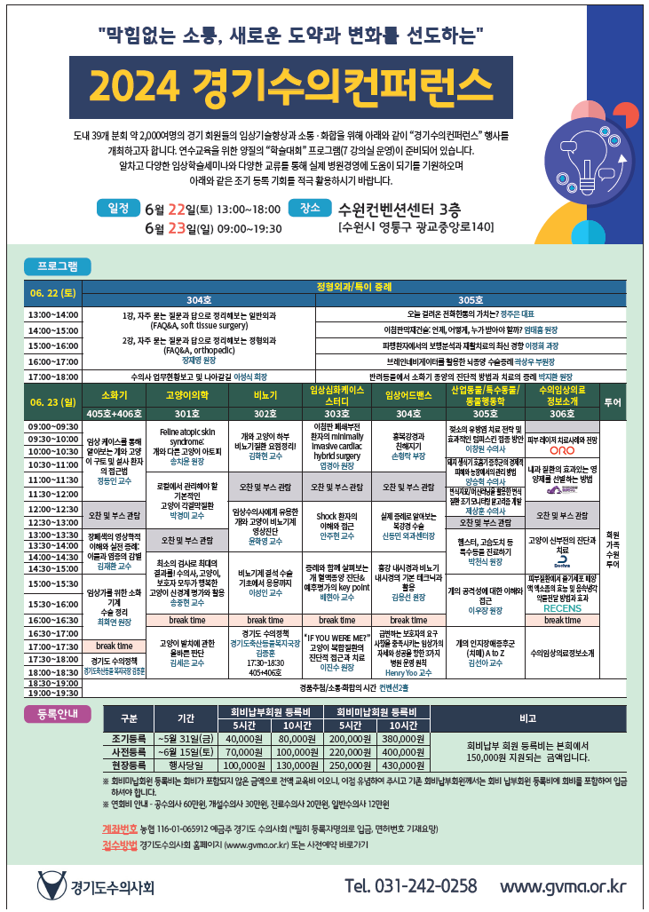 경기도수의사회(회장 이성식, 이하 경수회)가 주최하는 ‘2024 경기수의컨퍼런스’가 6월 22일(토)~23일(일) 수원컨벤션센터에서 개최된다.