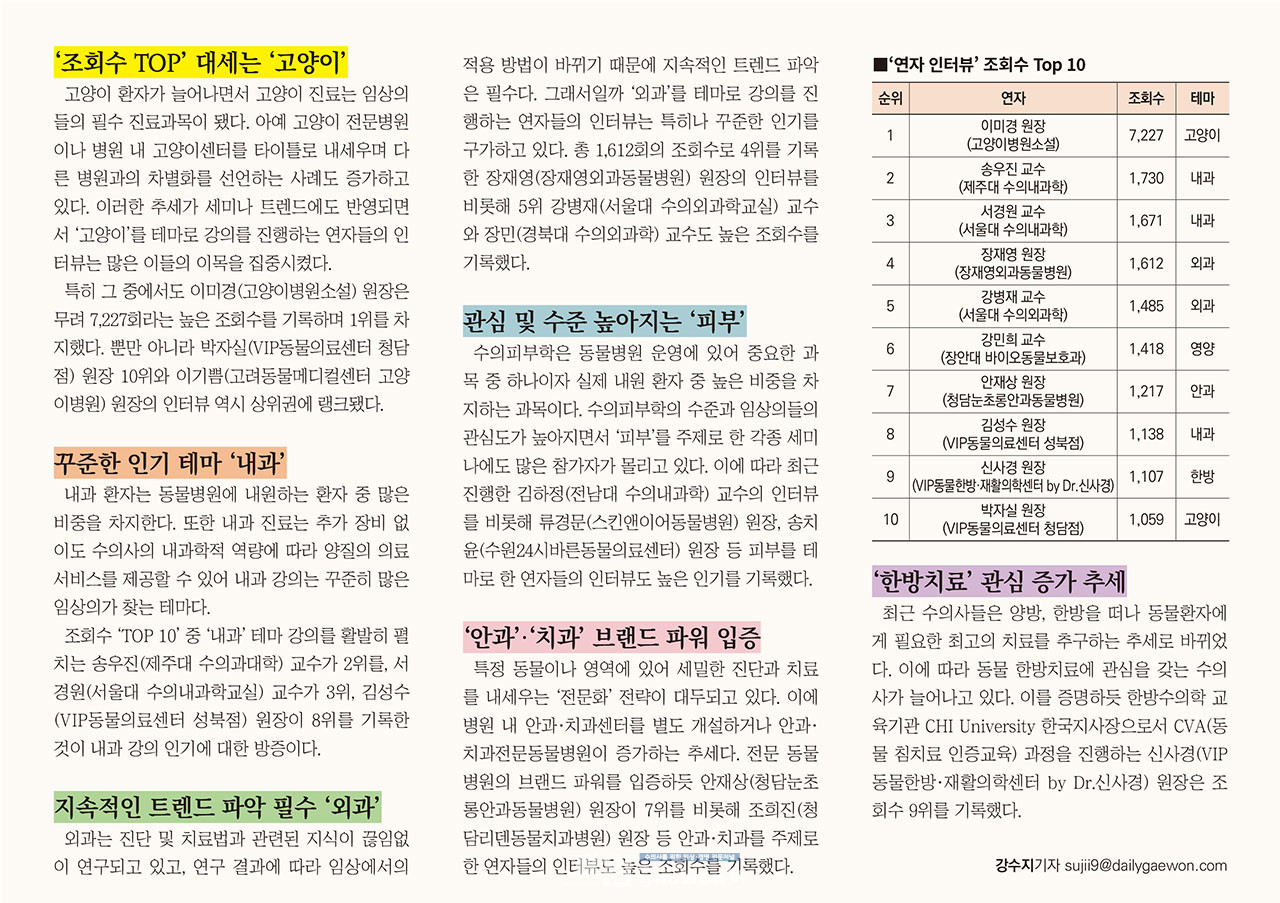 외과는 진단 및 치료법과 관련된 지식이 끊임없이 연구되고 있고, 연구 결과에 따라 임상에서의 적용 방법이 바뀌기 때문에 지속적인 트렌드 파악은 필수다. 그래서일까 ‘외과’를 테마로 강의를 진행하는 연자들의 인터뷰는 특히나 꾸준한 인기를 구가하고 있다. 총 1,612회의 조회수로 4위를 기록한 장재영(장재영외과동물병원) 원장의 인터뷰를 비롯해 5위 강병재(서울대 수의외과학교실) 교수와 장민(경북대 수의외과학) 교수도 높은 조회수를 기록했다.