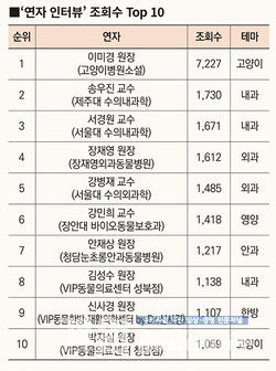 특히 그 중에서도 이미경(고양이병원소설) 원장은 무려 7,227회라는 높은 조회수를 기록하며 1위를 차지했다. 뿐만 아니라 박자실(VIP동물의료센터 청담점) 원장 10위와 이기쁨(고려동물메디컬센터 고양이병원) 원장의 인터뷰 역시 상위권에 랭크됐다.