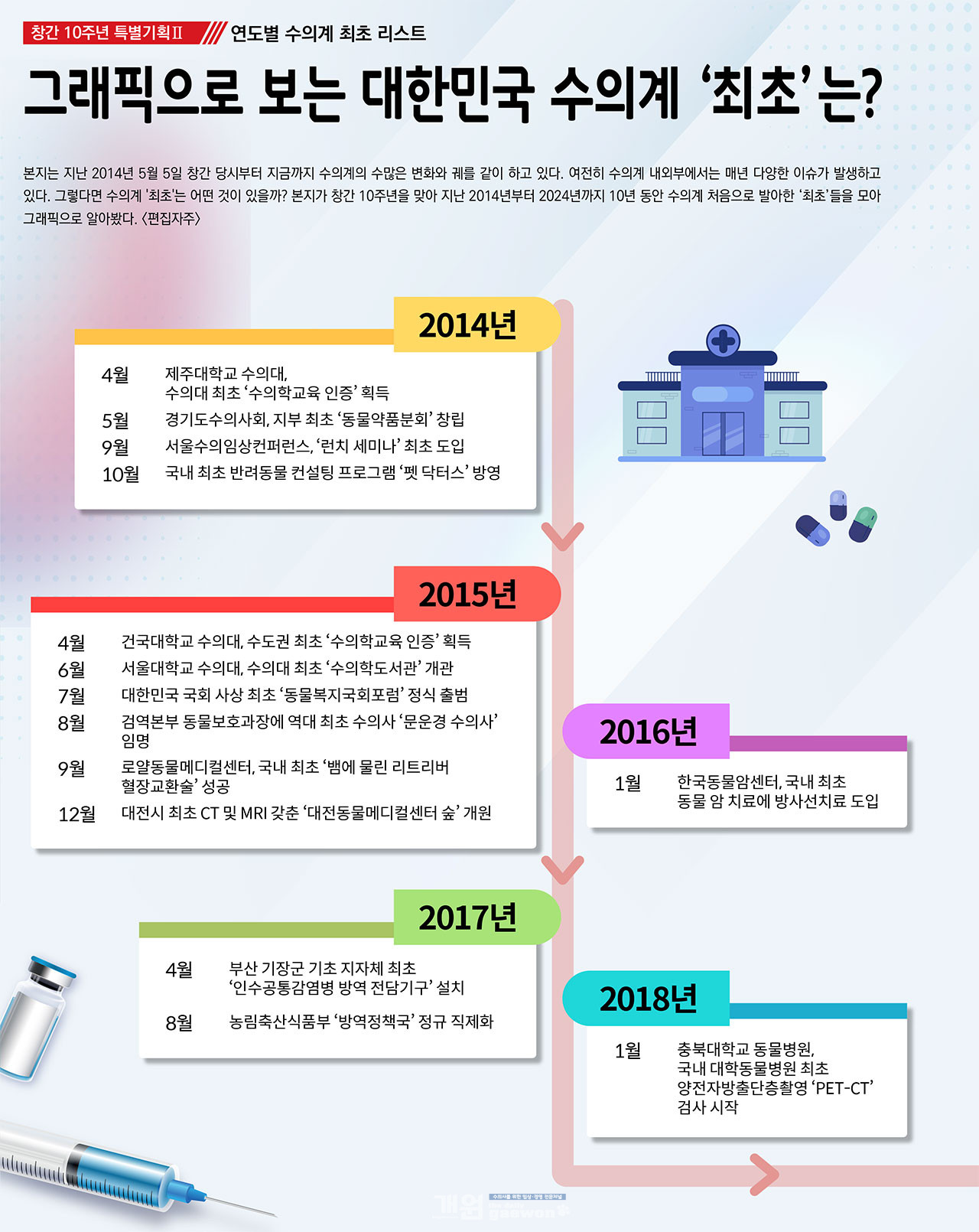본지는 지난 2014년 5월 5일 창간 당시부터 지금까지 수의계의 수많은 변화와 궤를 같이 하고 있다. 여전히 수의계 내외부에서는 매년 다양한 이슈가 발생하고 있다. 그렇다면 수의계 '최초'는 어떤 것이 있을까? 본지가 창간 10주년을 맞아 지난 2014년부터 2024년까지 10년 동안 수의계 처음으로 발아한 ‘최초’들을 모아 그래픽으로 알아봤다. <편집자주>