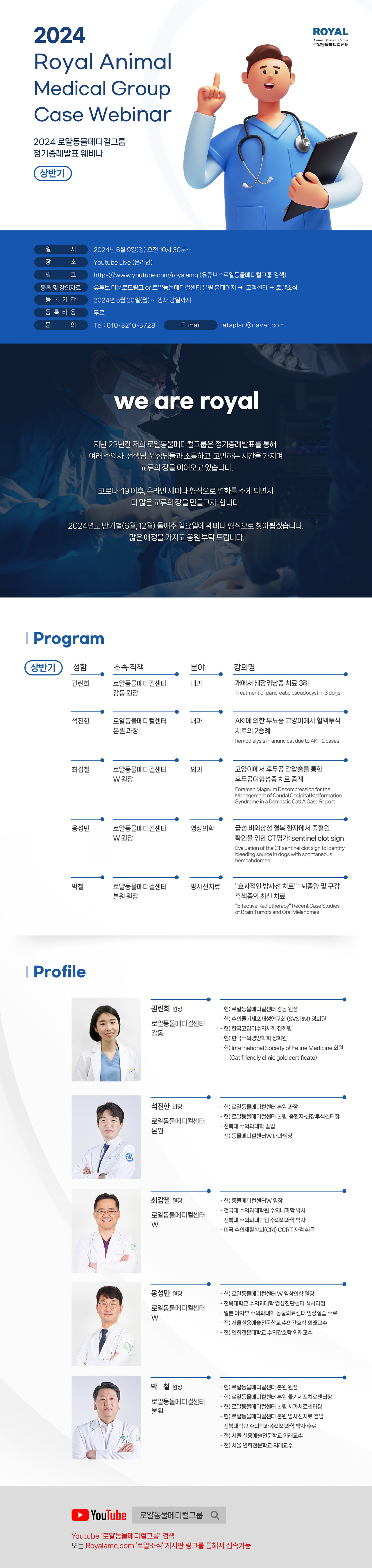 이번 상반기 증례발표 웨비나는 총 5개의 증례발표로 진행된다. 권린희(로얄동물메디컬센터 강동) 원장이 ‘개에서 췌장위낭종 치료 3례’를, 석진한(로얄동물메디컬센터 본원) 과장이 ‘AKI에 의한 무뇨증 고양이에서 혈액투석치료의 2증례’를, 최갑철(로얄동물메디컬센터 W) 원장이 ‘고양이에서 후두공 감압술을 통한 후두공이형성증 치료 증례’를 발표한다.