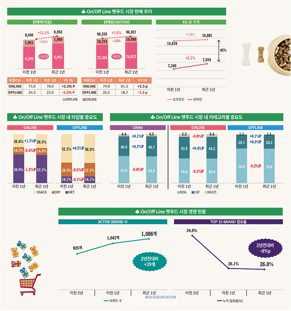 닐슨아이큐(NIQ)코리아가 지난 5월 17일 킨텍스에서 열린 ‘2024 펫케어 시장’ 설명회에서 발표한 ‘리테일 판매 데이터를 통한 2024 한국 펫푸드 시장 전망’ 자료에 따르면, 국내 펫푸드 시장은 온라인 채널 중심으로 전년대비 11.1% 성장했다. 전반적인 소비재 시장이 침체 됐음에도 불구하고 반려인구 증가에 따른 수요가 확대된 것으로 보인다. 또한 오프라인 매장은 스낵 판매 집중도가 높으며, 주식의 비중은 지속적인 하락세를 나타냈다. 캣푸드의 경우는 온라인에 더욱 집중하는 모습이다. 특히 온라인 시장에 진입한 브랜드 수는 상승한 반면 상위 브랜드의 집중도는 낮아지는 경향을 보이고 있어 경쟁이 심화되고 있는 것으로 분석된다. 따라서 성장하는 시장 내 경쟁력을 갖추기 위한 전략이 필요한 시점이다. <편집자주>