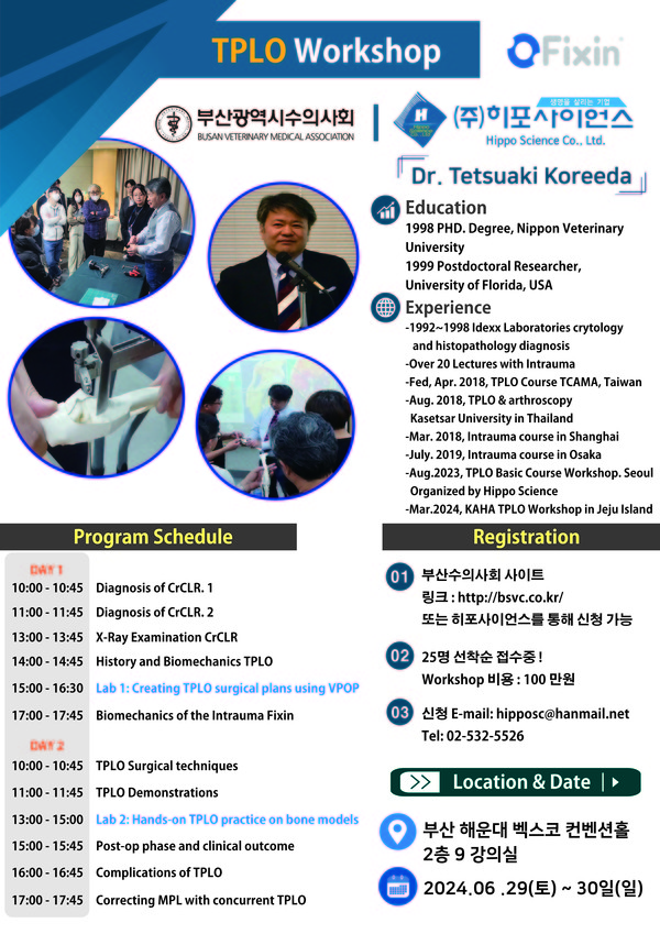 이번 ‘2024 부산수의컨퍼런스’에서 진행되는 TPLO 워크숍 등록은 부산수의컨퍼런스 홈페이지(bsvc.co.kr/) 또는 히포사이언스(hipposc@hanmail.net 또는 02-532-5526)를 통해 가능하다.