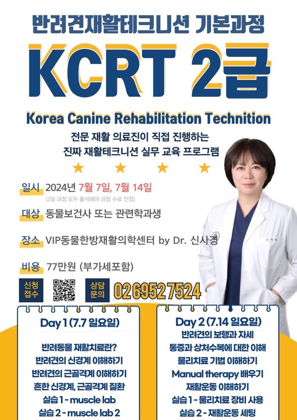 신사경(VIP동물한방·재활의학센터 by Dr. 신사경) 원장이 처음으로 ‘반려견재활테크니션 기본과정 KCRT 2급’ 세미나를 7월 7일과 14일 총 2회에 걸쳐 각 오전 9시부터 오후 5시까지 개최한다.