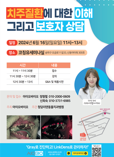 세미나는 치과의사·수의사 복수면허자인 조희진 원장이 ‘치주질환에 대한 이해 그리고 보호자 상담’을 주제로 오전 11시 30분부터 강의한다. 강의 후에는 Q&A 시간과 ‘큐레이’ 제품 시연이 있을 예정이다.