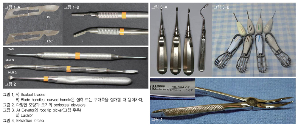 일반적으로 일반 외과수술에 쓰이는 기구 즉, scalpel blade(치과에서는 No. 15 또는 15c가 효과적)<그림 1-A>, blade handle (No. 5)<그림 1-B>, scissor, forcep, needle holder, 봉합사(흡수성 단사 4-0 또는 5-0; ex- Monocryl®)들이 치과에서 흔히 사용되고 있다.