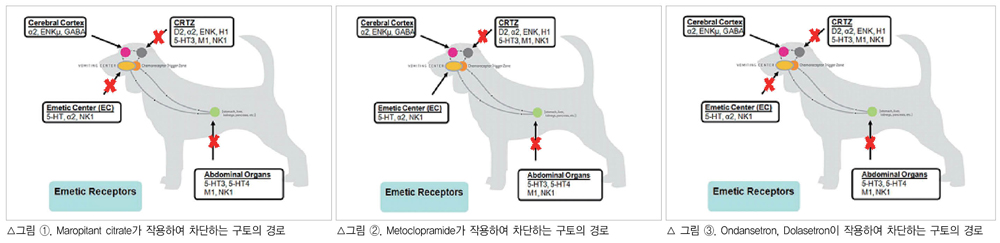 따라서 고양이에서는 위장관계 운동의 촉진 효과를 기대할 때에 주로 metoclopramide를 처방하고, dolasetron, Cerenia®, ondansetron이 고양이 급성 구토에서 우선 고려된다.