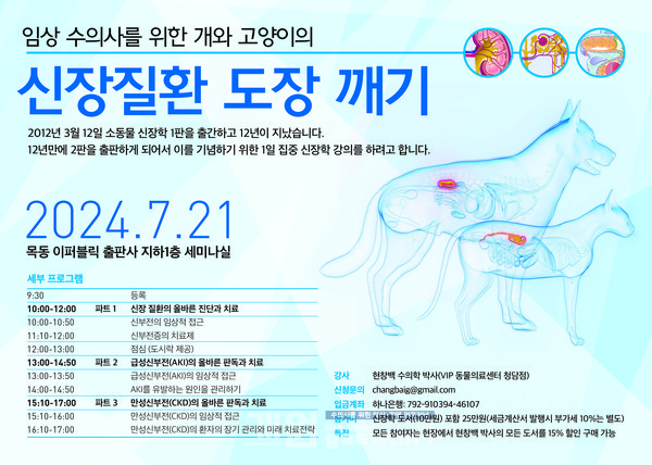 범문에듀케이션은 이번 2판 출판을 기념해 ‘임상수의사를 위한 개와 고양이의 신장질환 도장 깨기’ 세미나를 오는 7월 21일(일) 오전 9시 30분부터 오후 5시까지 목동 이퍼블릭 출판사 지하 1층 세미나실에서 개최한다.