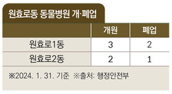 현재 원효로동 내 동물병원 5개소 가운데 가장 최근에 개원한 병원이 2015년 개원으로 10년째 신규 개원이 없는 상태다. 나머지 4개소는 모두 2010년대에 개원해 10년 이상 운영 중이다.