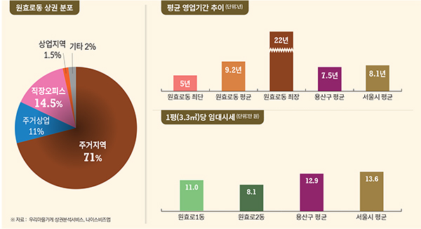 원효로1동은 주거지역 86%, 주거상업 13%, 기타지역 1%로 구성된 주거지역 위주의 상권이다. 원효로2동은 주거지역 56%, 직장오피스 29%, 주거상업 9%, 기타지역 3%, 상업지역 3%로 구성되어 있다.