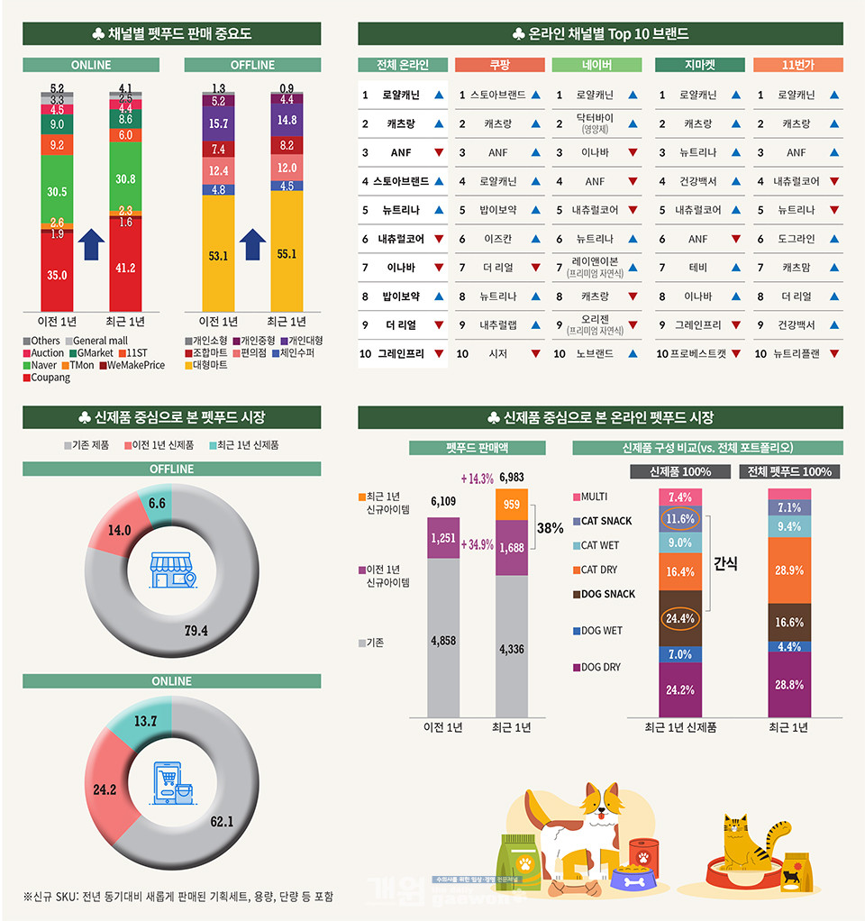 닐슨아이큐(NIQ) 코리아가 지난 5월 17일 킨텍스에서 열린 ‘2024 펫케어 시장’ 설명회에서 발표한 ‘리테일 판매 데이터를 통한 2024 한국 펫푸드 시장 전망’에서 국내 펫푸드 채널 트렌드 온라인 리테일러별 특성 분석에 따르면, 최근 1년 온라인에서의 펫푸드 판매율은 ‘쿠팡’이 41.2%로 1위를 차지했다. 이는 전년도 35% 대비 6% 이상 크게 성장한 수치다. 이어 ‘네이버’가 30.8%로 1년전과 비슷한 판매율을 나타냈다. 오프라인은 ‘대형마트’ 판매가 55.1%로 가장 많은 비중을 차지했다. 온라인 채널별 Top 10 브랜드를 살펴보면, ‘로얄캐닌’이 쿠팡을 제외한 채널 전반에서 상승하며, 온라인 판매 1위를 유지했다. 온라인 채널은 신제품 유입 확대에 가장 중요한 채널로서 최근 2년간 출시된 신제품이 온라인 시장의 성장을 견인한 것으로 나타났다. 온라인 신제품은 사료보다 간식 비중이 높았으며, 최근 1~2년새 펫푸드 신제품 비중은 38%로 높게 나타났다. <편집자주>