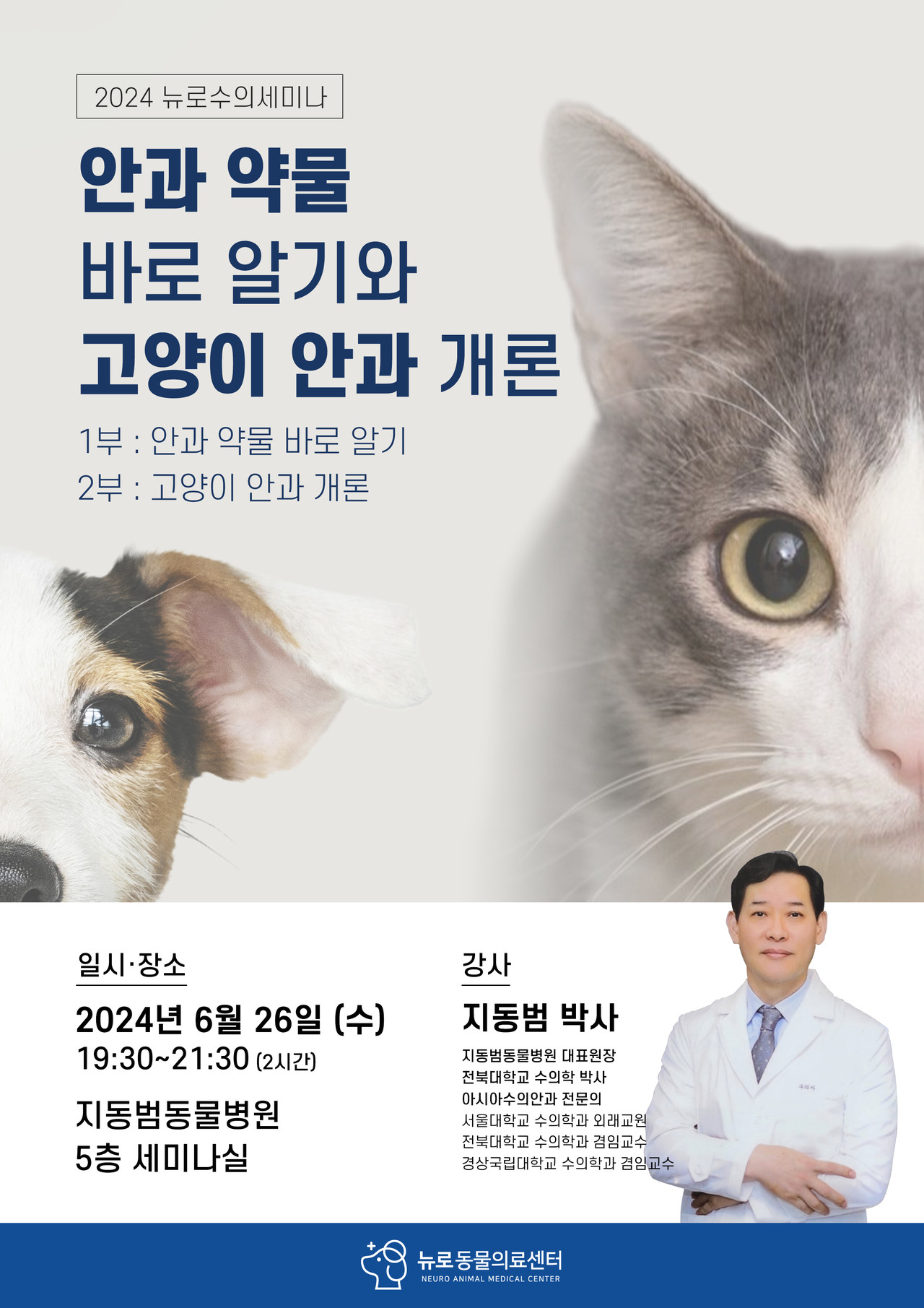 이번 세미나는 아시아수의안과전문의인 지동범(지동범동물병원) 원장이 연자로 나서 ‘안과 약물 바로 알기와 고양이 안과 개론’을 주제로 강의할 예정이다.