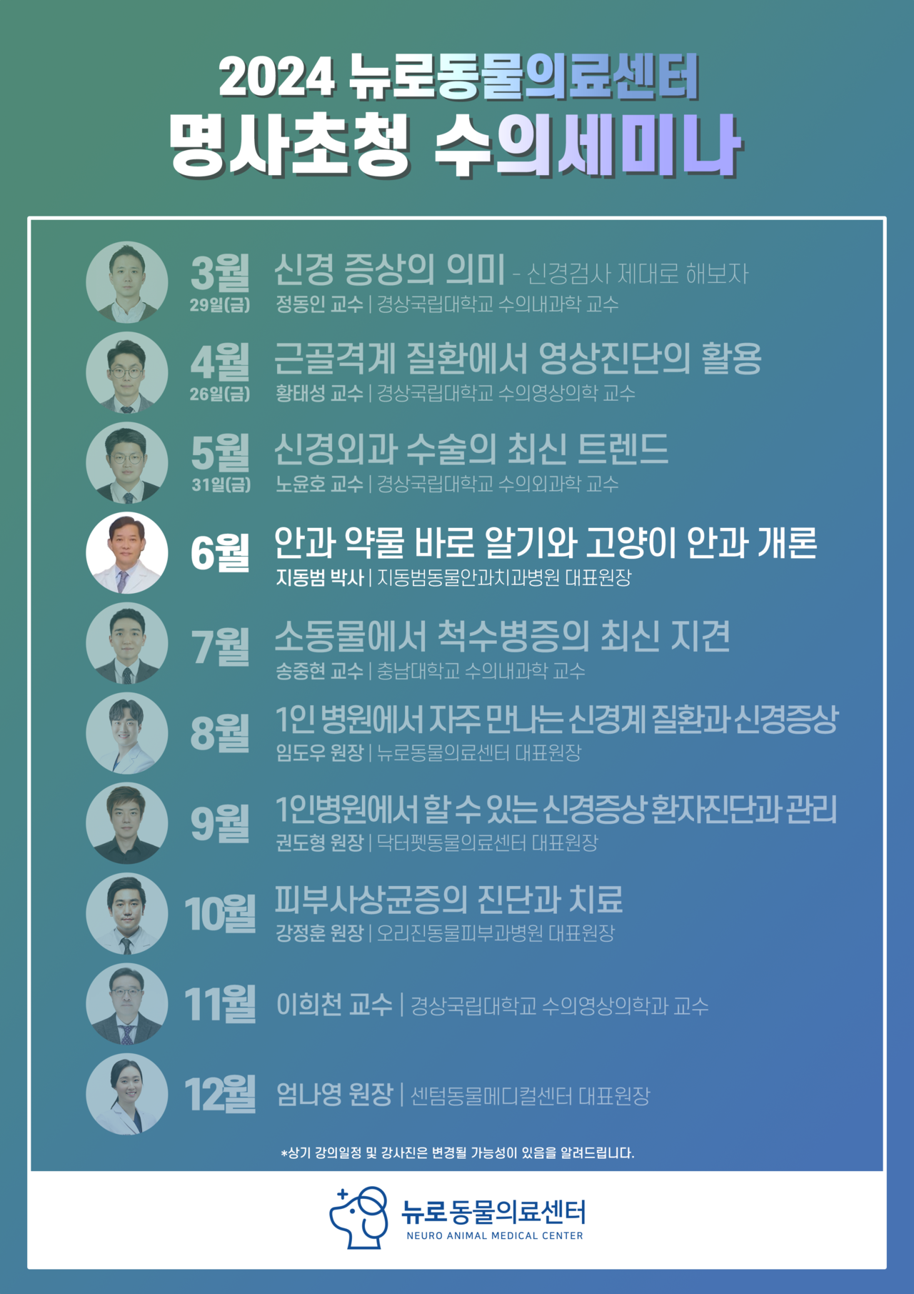 뉴로수의 세미나, 매월 말 개최...안과 테마 총 2강 지동범동물병원 5층 세미나실