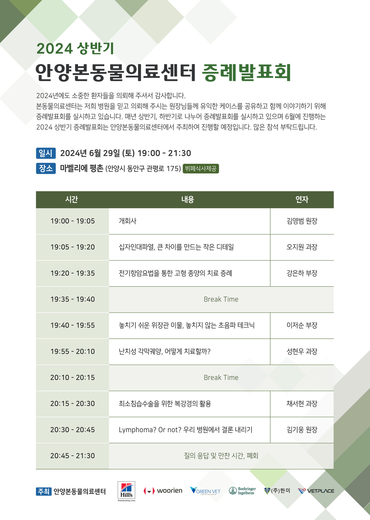 안양본동물의료센터가 ‘2024 상반기 증례발표회’를 오는 6월 29일(토) 오후 7시부터 9시 30분까지 마벨리에 평촌에서 개최한다.
