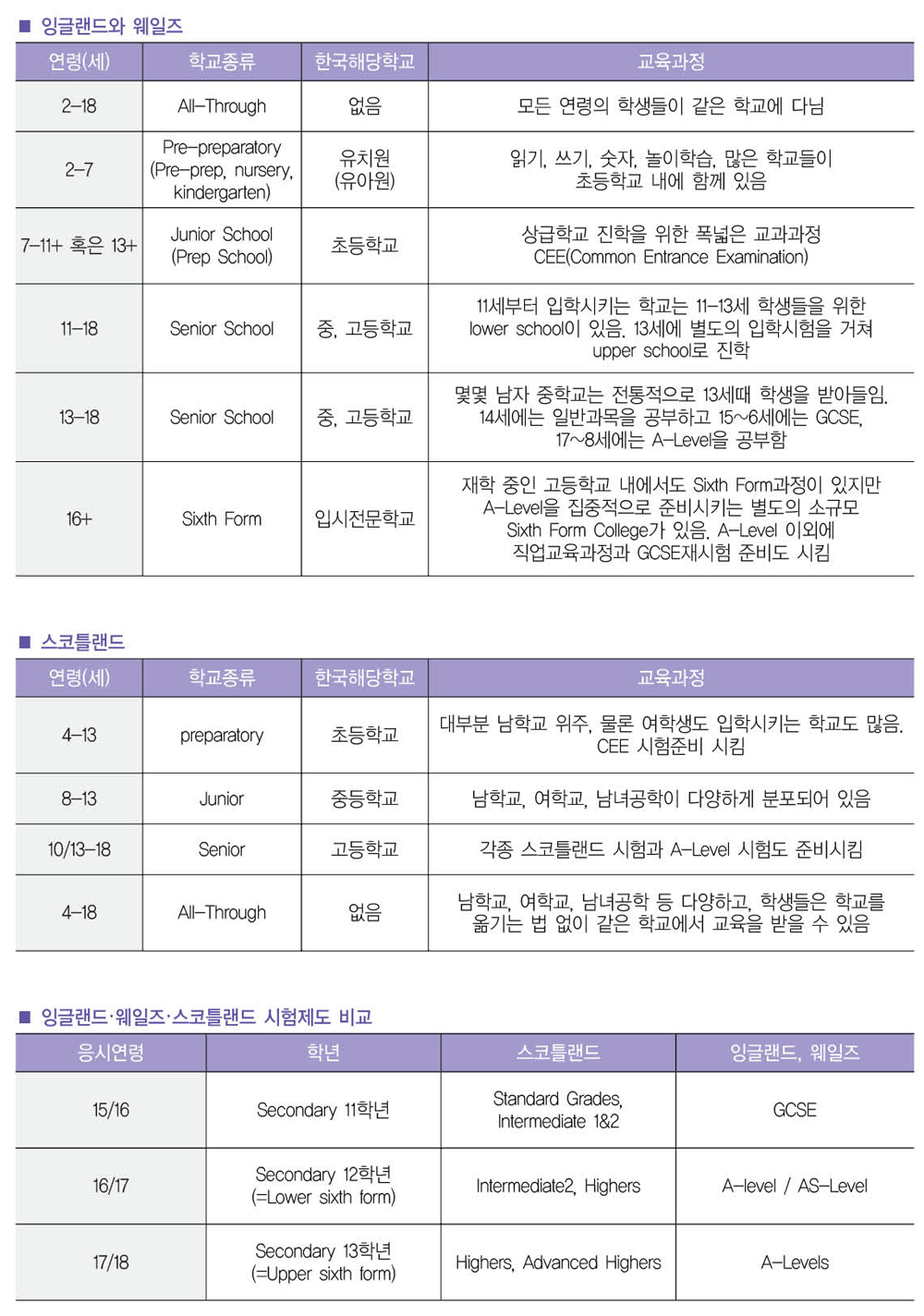 영국이라 함은 잉글랜드, 웨일즈, 스코틀랜드, 북아일랜드를 포함한 의미인데, 이 중 스코틀랜드는 자체의 법률, 교회, 교육체계를 가지고 있어서 어느 지역으로 보내느냐에 따라 각 지역의 교육제도를 면밀히 검토할 필요가 있다.