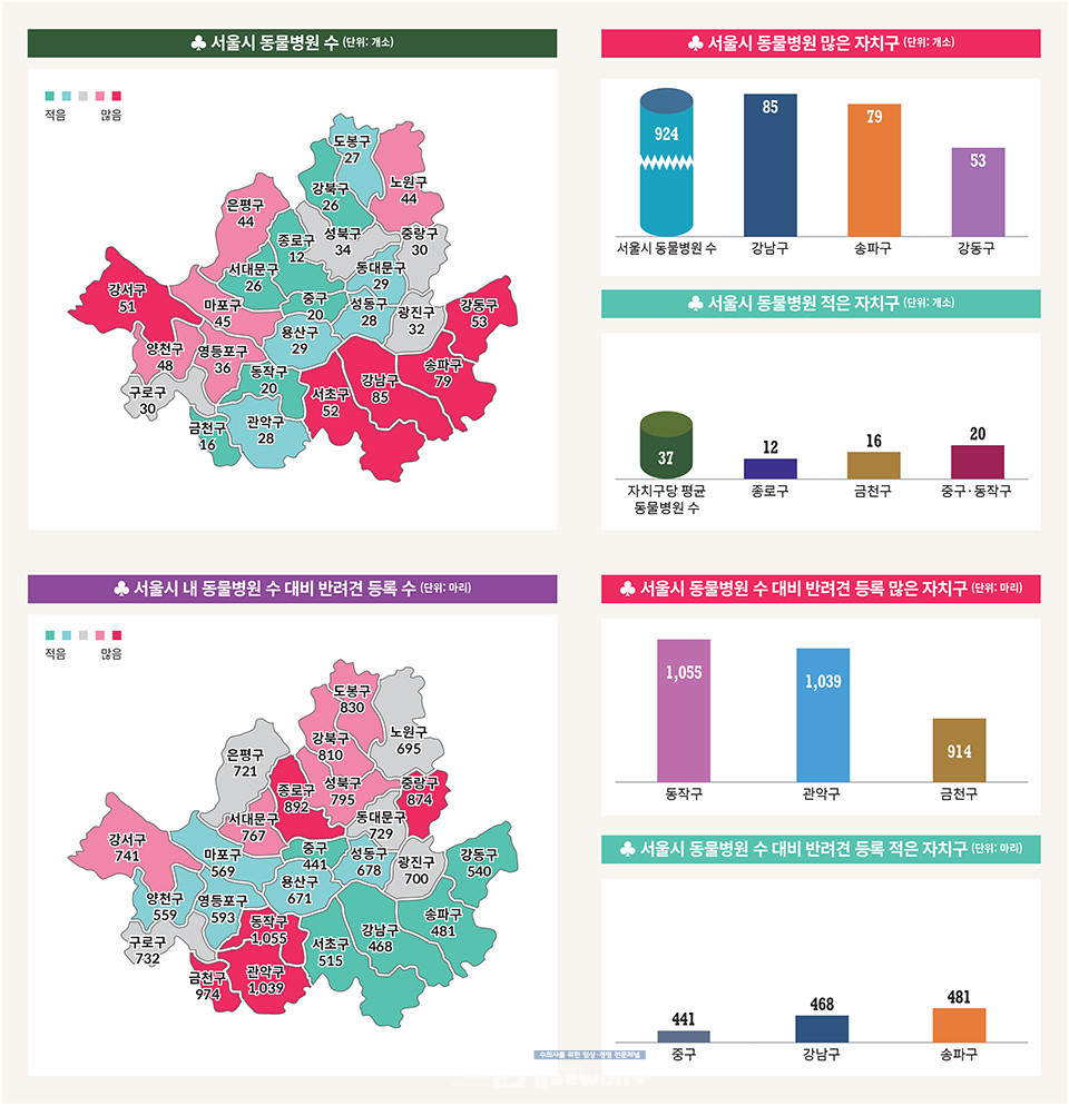 서울디지털재단이 농림축산식품부의 동물등록 현황 데이터와 지방행정 인허가 데이터 개방서비스의 데이터를 활용해 반려동물 관련 업종 현황을 분석했다. 분석 결과에 따르면, 서울시의 동물병원 수는 총 924개소로 자치구당 평균 37개소이며, 병원 1개소당 반려견 등록 수는 662마리로 조사됐다. 그 중 동물병원이 가장 많은 자치구는 ‘강남구’가 85개소로 1위를 차지했으며, 송파구가 79개소, 강동구가 53개소로 그 뒤를 이었다. 가장 적은 자치구로는 ‘종로구’가 12개소로 가장 적었으며, 금천구가 16개소, 중구 및 동작구가 20개소로 이는 자치구별 반려견 등록 수와 유사한 분포를 나타냈다. 동물병원 수 대비 반려견 등록 수는 ‘동작구’가 1,055마리로 가장 많았고, 관악구가 1,039마리, 금천구가 914마리를 기록한 반면, ‘중구’가 441마리, 강남구가 468마리, 송파구가 481마리로 조사됐다. ‘용산구’와 ‘성동구’는 동물병원 수와 병원 수 대비 반려견 등록 수가 모두 적은 반면, ‘강서구’는 동물병원 수와 병원 수 대비 반려견 등록 수가 모두 많았다. 또한 종로구, 동작구, 금천구의 동물병원 수는 평균보다 10개, 병원 수 대비 반려견 등록 수는 100마리 이상 많은 것으로 나타났다. <편집자주>