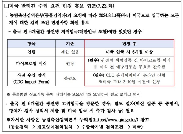 강화된 입국 요건은 8월 1일부터 적용된다. 필수 요구 조건으로는 △미국 도착 시 6개월령 이상 △국제표준화기구(ISO) 호환 마이크로칩 내장 △도착 시 건강한 상태 △CDC 개 수입 양식 영수증 소지 △Certification of U.S.-issued Rabies Vaccination form 또는 USDA-endorsed export health certificate 등이 있다.