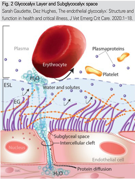 이로 인해 이 패러다임의 결과는 혈관내피세포가 아니라 Glycocalyx 층의 안전성이 미세혈관 장벽을 가로질러 정상적인 유체 선속을 유지하는 데 필수적이라는 것이다[Fig. 2].