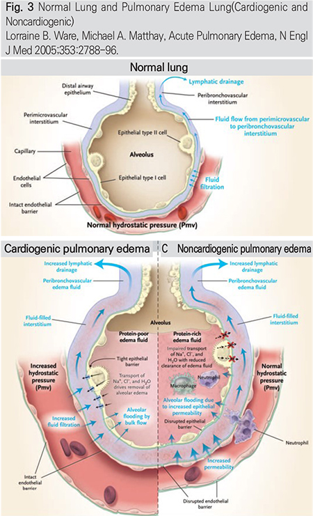 폐에서 혈장 단백질의 reflection coefficient 반사계수는 0.7~0.95로 다른 조직보다 낮고 모세혈관을 가로지르는 교질삼투구배를 감소시킨다[Fig. 3].