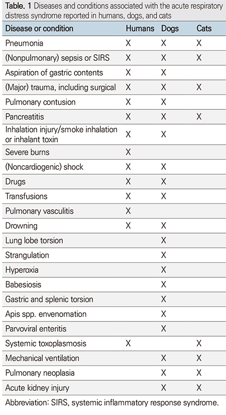 반려견의 경우 폐 질환으로 인한 경우가 더 많았으며, 오연성폐렴이 주요 원인이었고, 반려묘의 경우 폐 또는 폐가 아닌 질환의 경우는 비슷했으며, 전신염증반응증후군(SIRS)이 주요 원인이었다. [Table. 1]에 사람과 수의학에서 확인되는 ARDS의 원인에 관해 나열되어 있다.