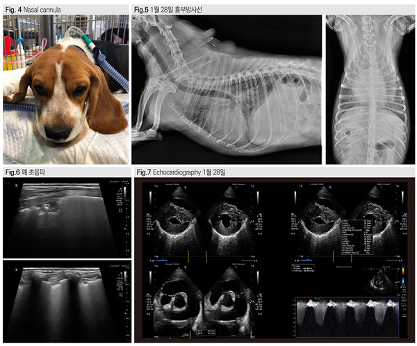 K는 K9, 12살 중성화한 암컷 비글로 매우 심한 기침과 기력저하 식욕 부진으로 2주 전 다른 병원에서 폐렴을 진단받고, 분무치료와 항생제 처방을 받아 개선되어 가는 도중 재발하여 1월 28일 본원에 내원했다.