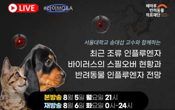 해마루반려동물의료재단(이사장 김소현)이 송대섭(서울대) 교수와 ‘최근 조류 인플루엔자 바이러스의 스필오버 현황과 반려동물 인플루엔자 전망’ 웨비나를 8월 5일(월) 오후 9시부터 아이해듀에서 진행한다.